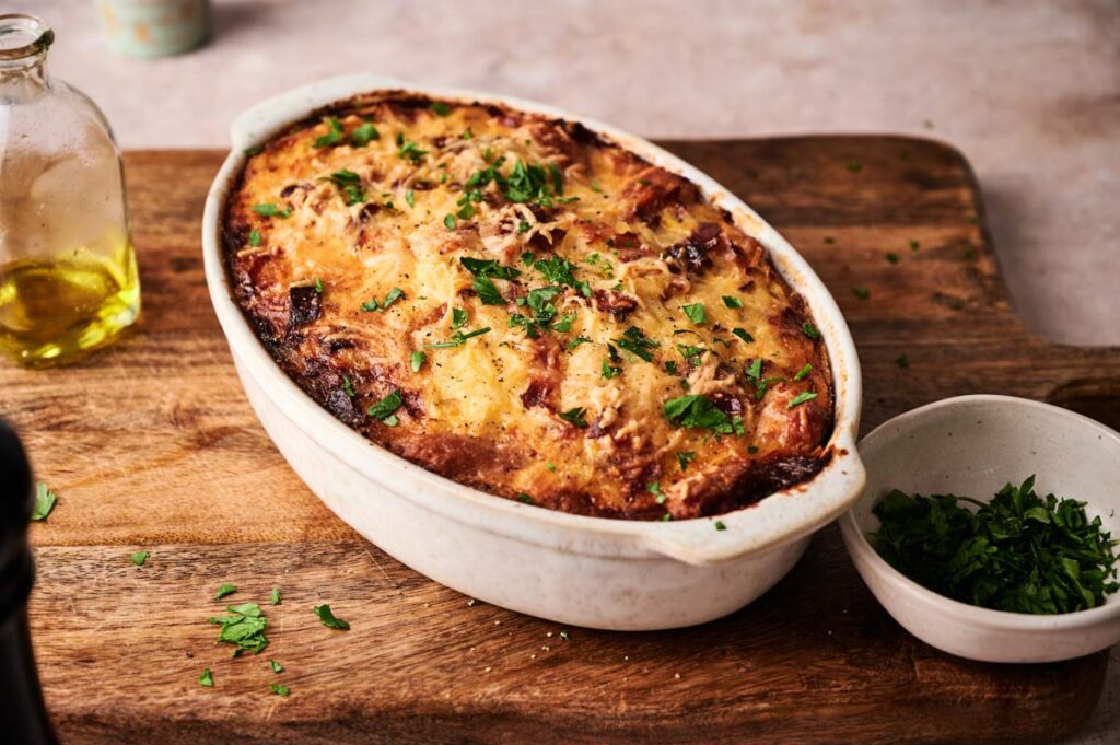Let it cool slightly for a few minutes before slicing—this makes it easier to slice neatly and serve, and gives the layers time to settle and firm up. I usually place the dish on a metal cooling rack like this when it comes out of the oven to help the air circulate and cool things evenly.