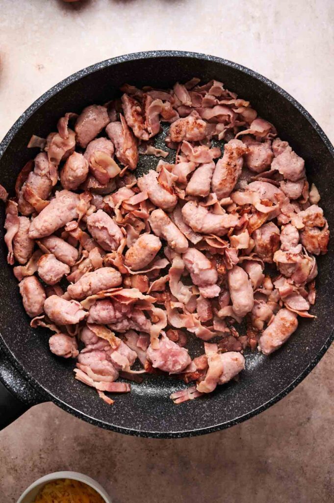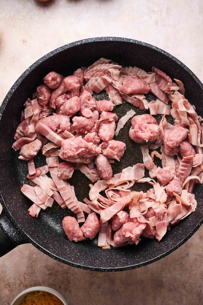 Cook the chopped bacon and sausage in a large skillet over medium heat until browned and cooked through. I use a large nonstick skillet like this one because it distributes heat evenly and makes cleanup easier.