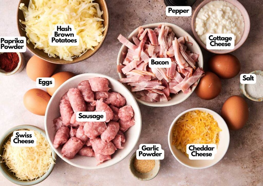 - Stir in the cooked bacon and sausage, hash browns, cheddar cheese, 1 ¾ cups of the Swiss cheese, garlic powder, paprika, and a pinch of salt and pepper. Mix until evenly combined.4 cups frozen shredded hash brown potatoes, 2 cups cheddar cheese, 2 cups Swiss cheese, ½ teaspoon garlic powder, ½ teaspoon paprika powder, Salt and pepper