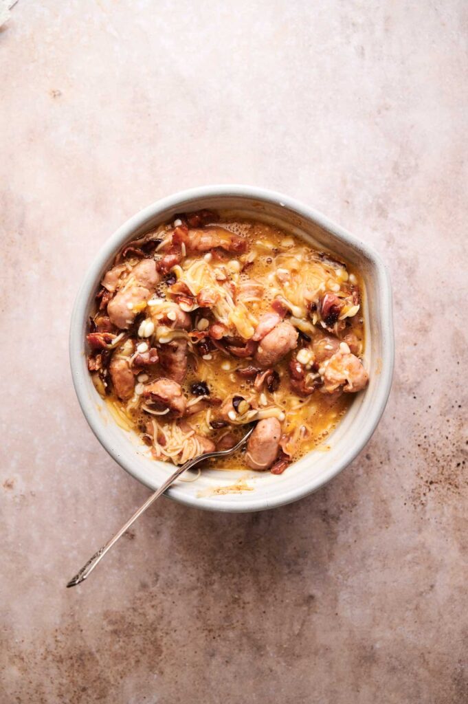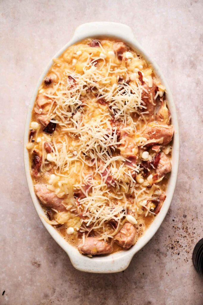- Drain the meat well: After browning the bacon and sausage, make sure to drain the excess grease so the casserole doesn’t turn out oily.