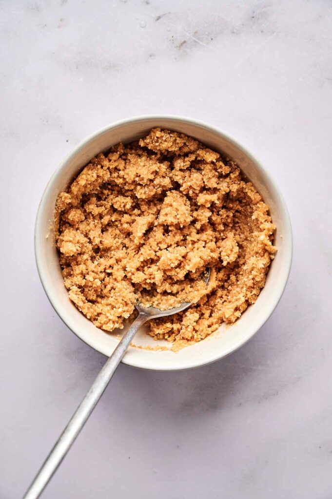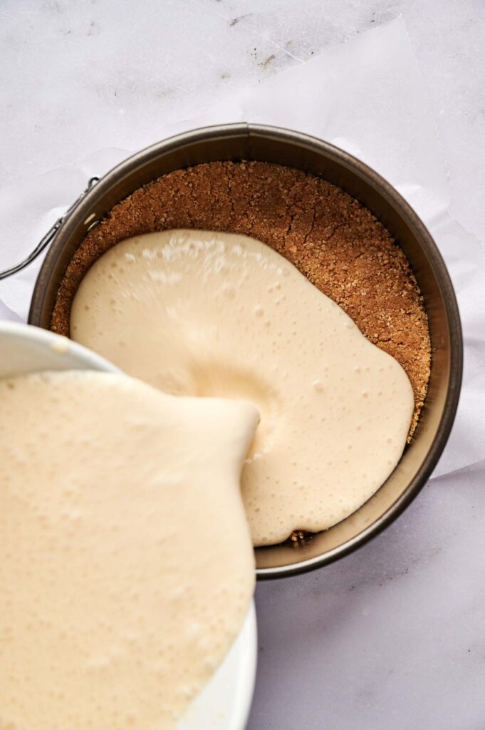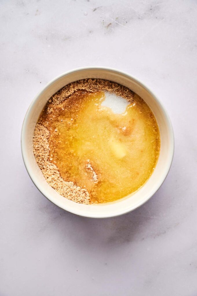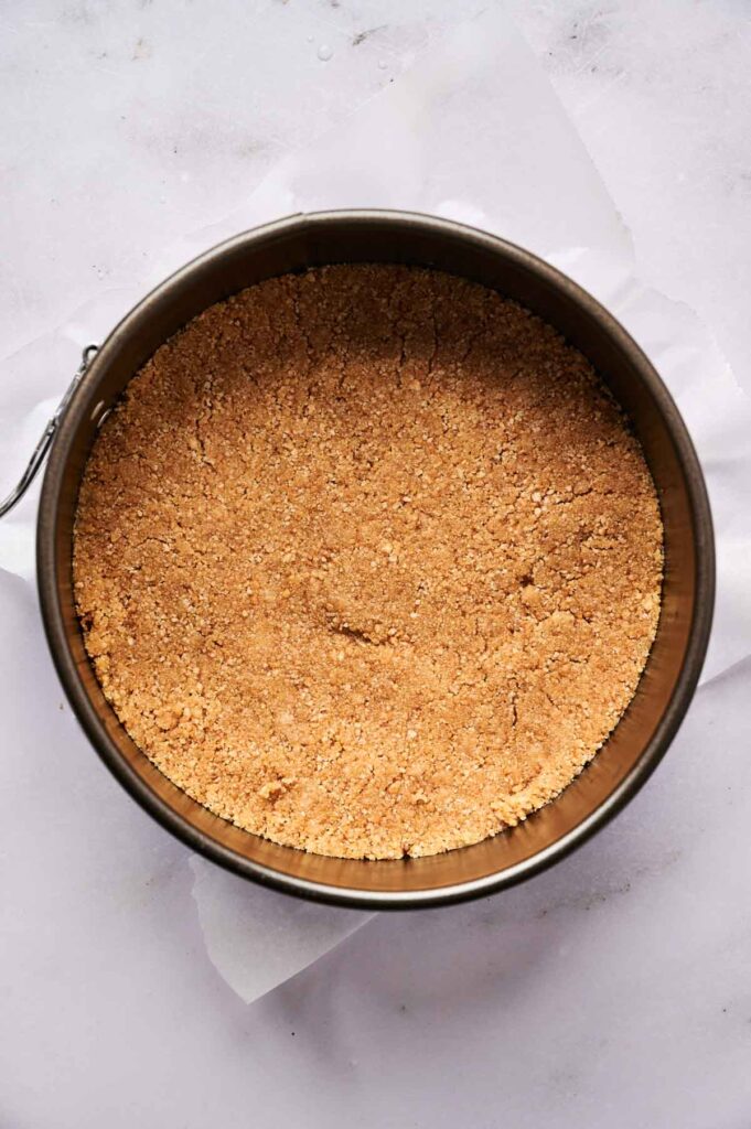 Line the bottom of a 7-inch springform pan with parchment paper to help with easy removal later. Mix the graham cracker crumbs, melted butter, and sugar in a bowl until you get a wet sand-like texture.