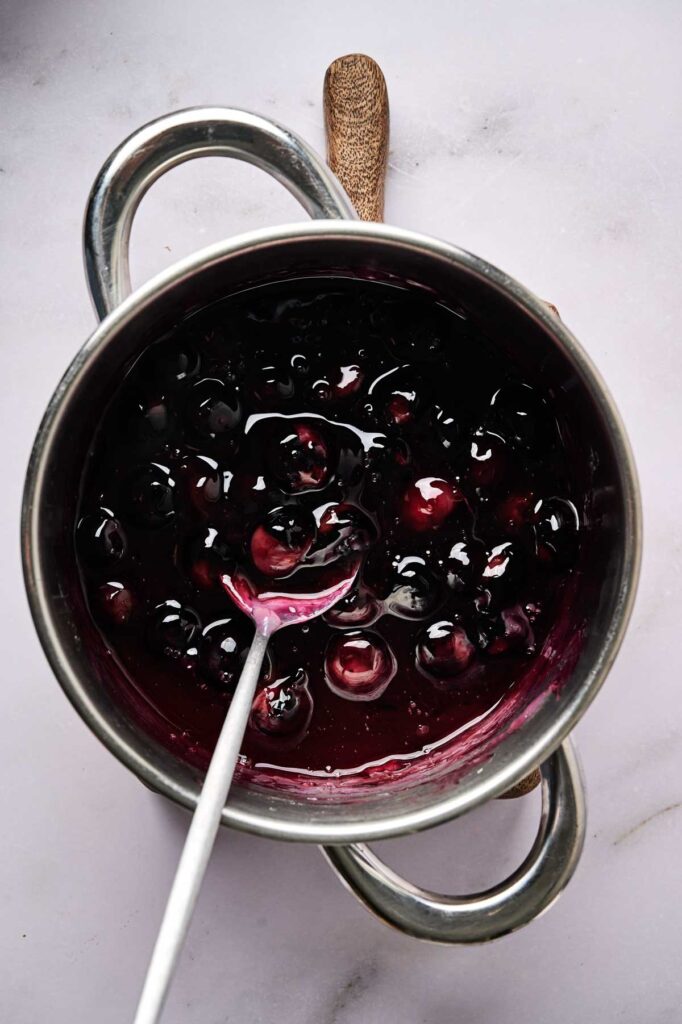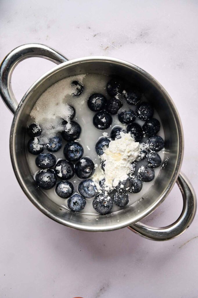 • In a saucepan over low heat, combine blueberries, sugar, cornstarch, lemon juice, and water. Simmer for 5–10 minutes until thick and syrupy. Remove from the heat and let it cool completely. Refrigerate until ready to use.