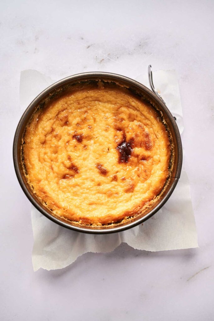 Once it’s out of the oven, carefully transfer the cheesecake to a wire rack or let the pan cool completely on the counter before moving it to the fridge.