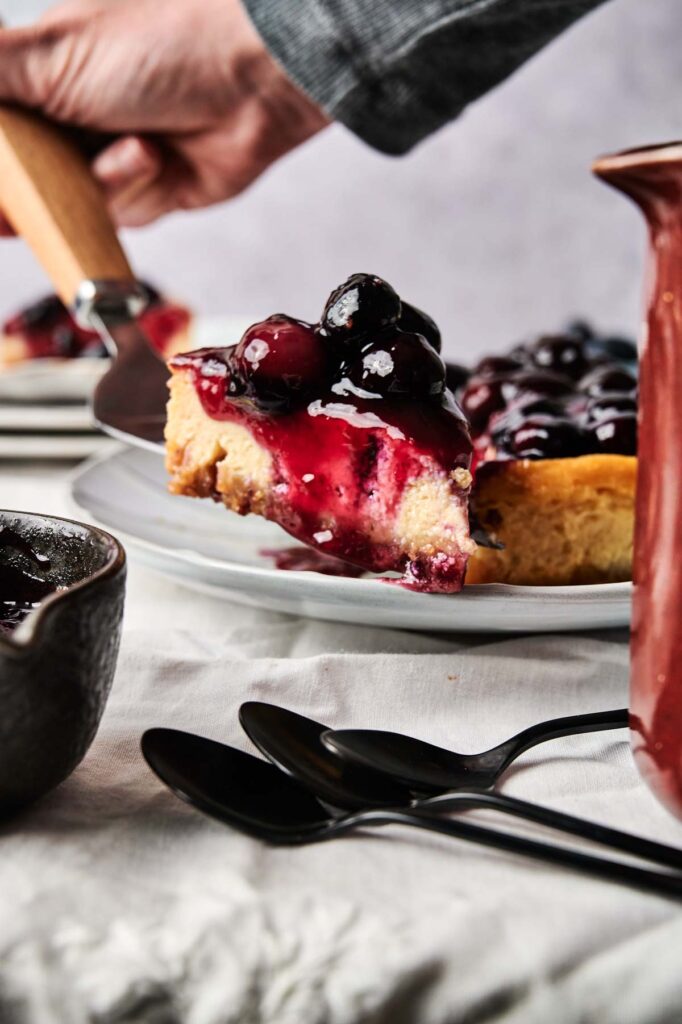 This blueberry cheesecake recipe goes great with a cup of coffee or strong black tea, especially if you’re serving it after a meal. For something extra, try adding a dollop of whipped cream, a few fresh berries, or a drizzle of white chocolate or lemon glaze.