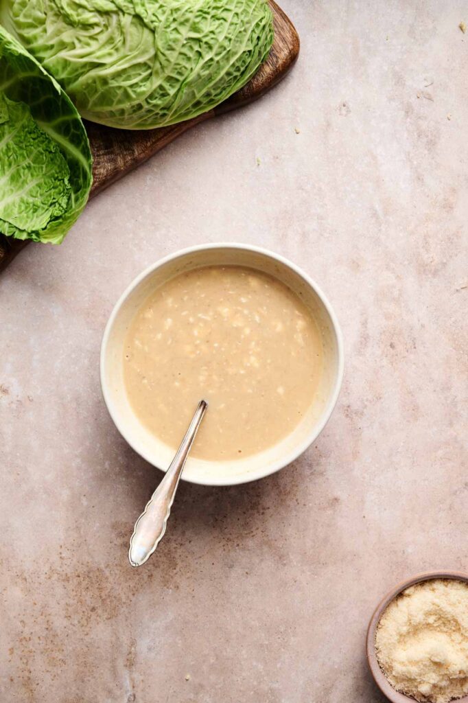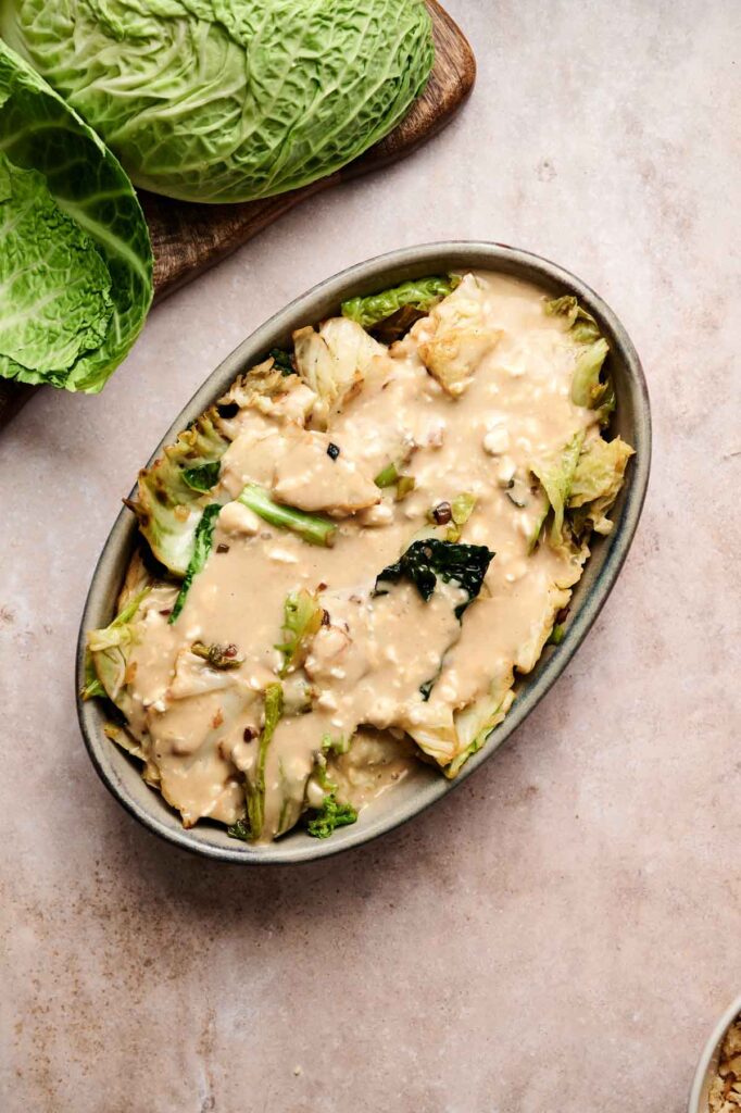 Spread this creamy layer evenly over the cabbage using the back of a spoon or spatula. A silicone spatula like this one makes it easy to spread smoothly and gets into the corners of the dish without tearing up the cabbage underneath.