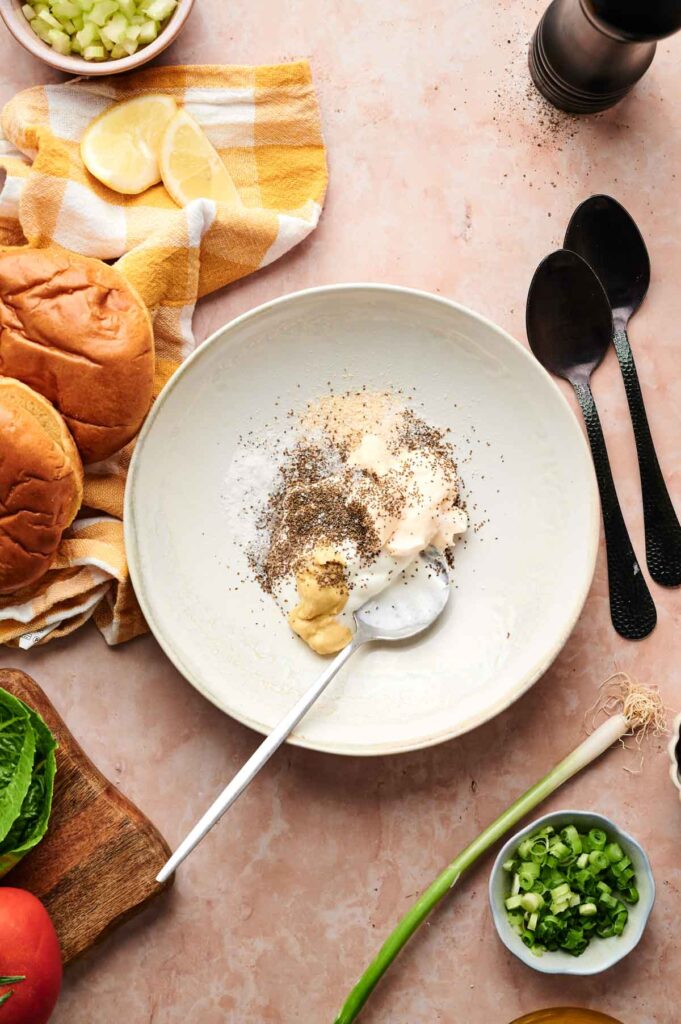 ¼ cup Greek yogurt, 3 tablespoons mayonnaise, 2 teaspoons Dijon mustard, ½ tablespoon lemon juice, ½ teaspoon onion powder, ¼ tablespoon celery seeds, Salt and pepper