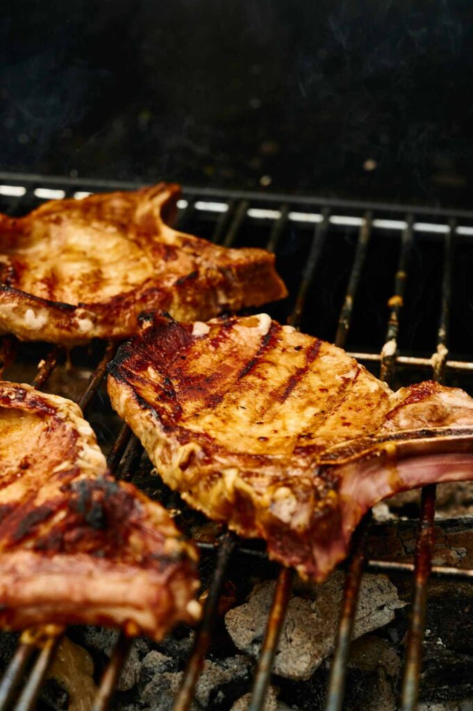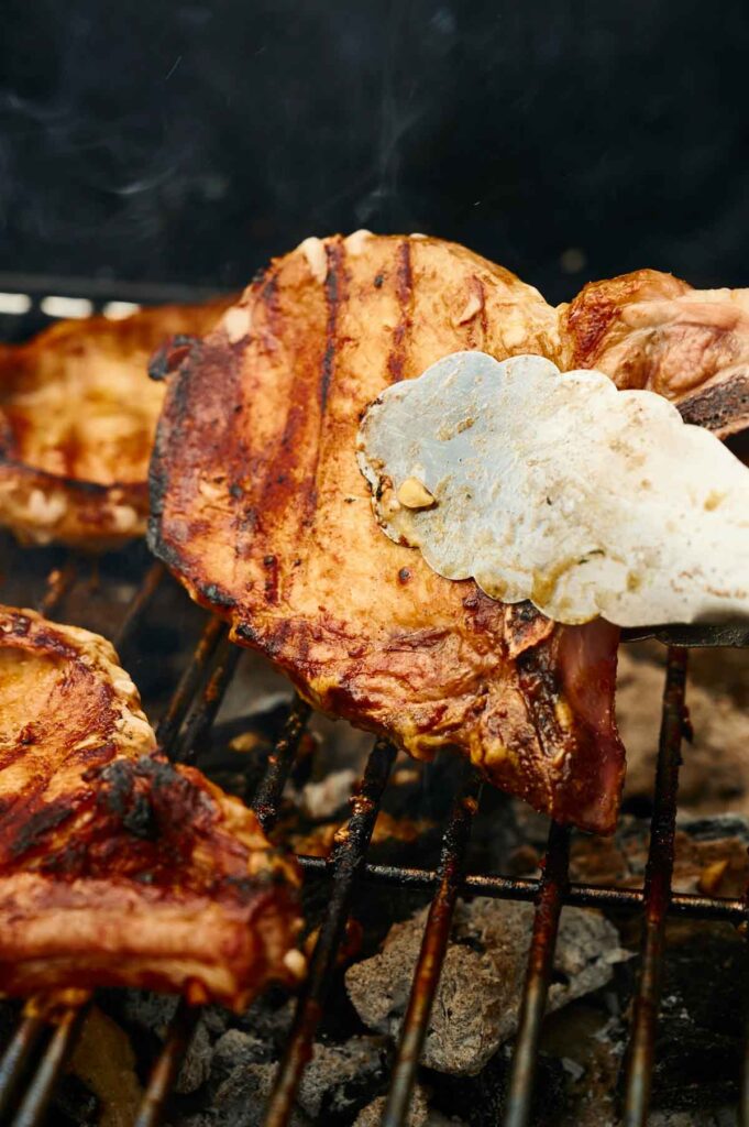 Take the pork chops out of the marinade and let the excess drip off—don’t rinse them or you’ll wash off the flavor. Sear the sides of the pork chops directly over high heat for 2 minutes per side until nicely charred.
