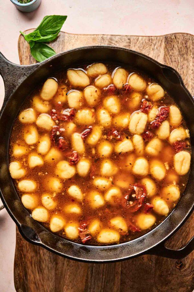 In the same skillet, toss in the gnocchi, chopped sun-dried tomatoes, and minced garlic. Give everything a quick stir until combined.