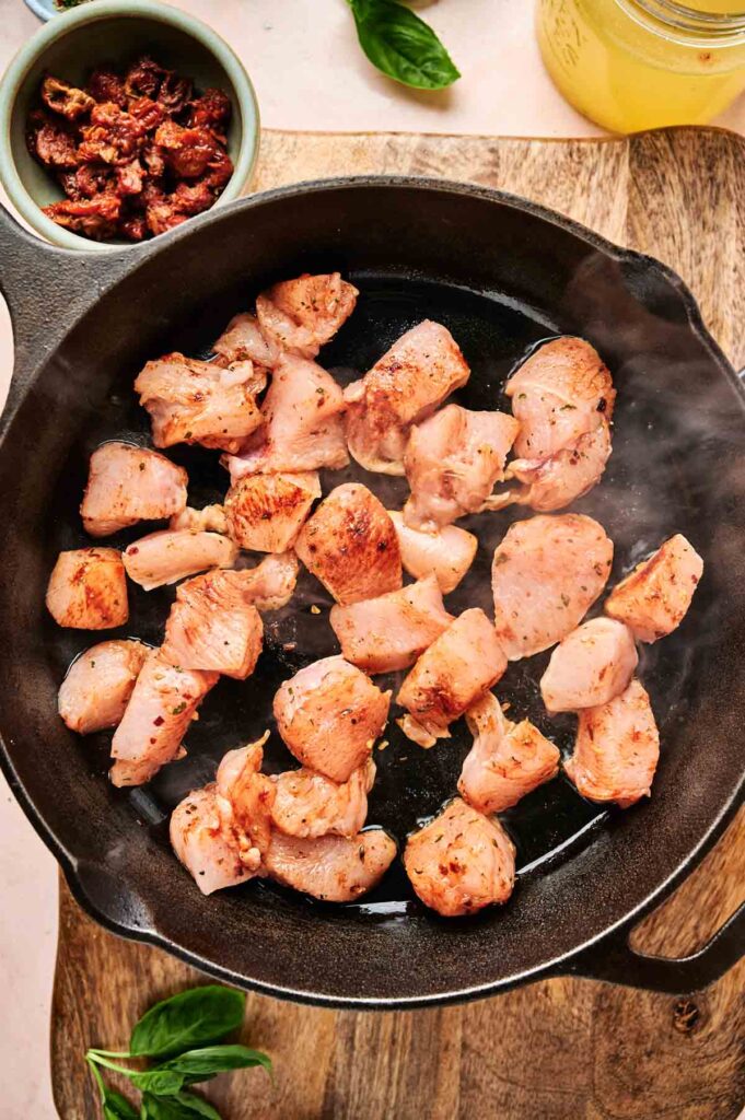 Toss your chicken cut into bite-sized pieces in Italian seasoning, paprika, salt, and pepper. Heat some olive oil in a large skillet over medium heat.