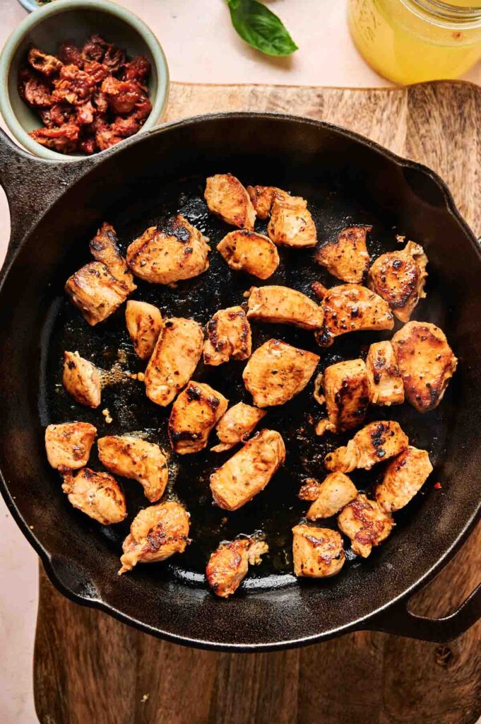 Sear the chicken without moving it for a few minutes so it gets a nice golden crust. Once the chicken is browned and cooked through, transfer it to a plate and set it aside.
