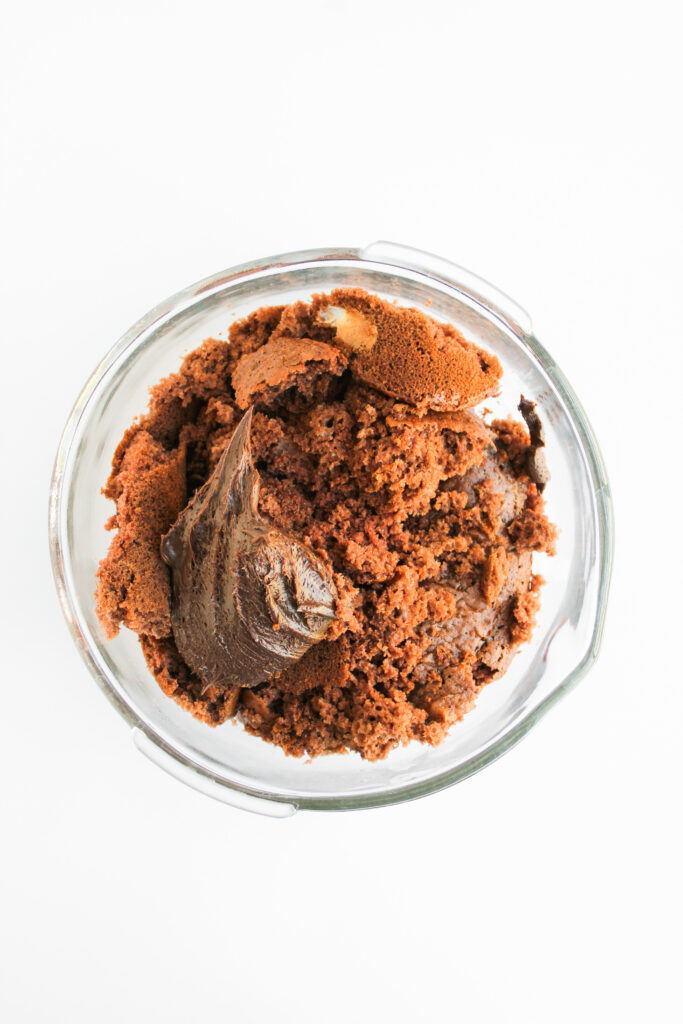 - Crumble the cooled cake into a large bowl. Add the chocolate frosting and mix until the mixture sticks together like dough.¾ cup chocolate frosting