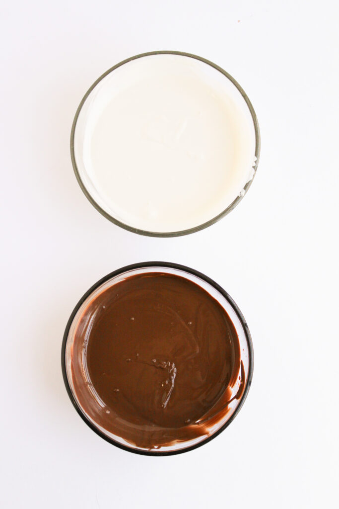 In separate bowls, melt the milk chocolate and white chocolate. I melt mine in these microwave-safe glass bowls—they’re heatproof, tempered, and super handy when you need to pour the chocolate smoothly.