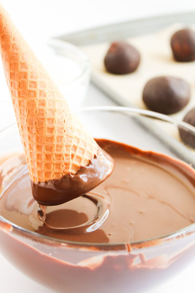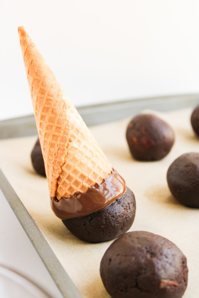 Dip the open end of each mini waffle cone into the melted chocolate while it’s still warm and smooth, not piping hot, but also definitely not when it’s already cooled and thickened. Gently press the cone onto each chilled cake ball and hold it there for a few seconds.