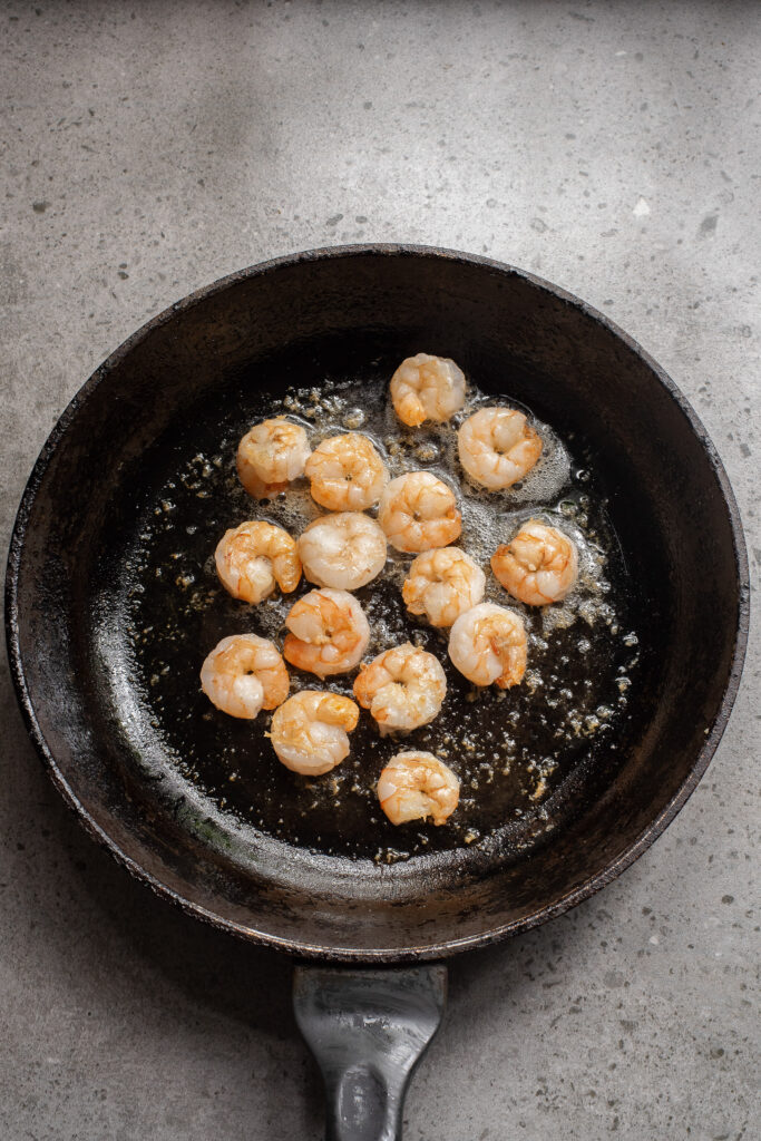Shrimp cooks fast and can get too chewy, rubbery, and dry, so watch the cook time. Also, work in batches if you need to; overcrowding the pan can drop the heat, which can cause the shrimp to steam instead of sear properly. Once done, transfer the shrimp to a plate and set aside.