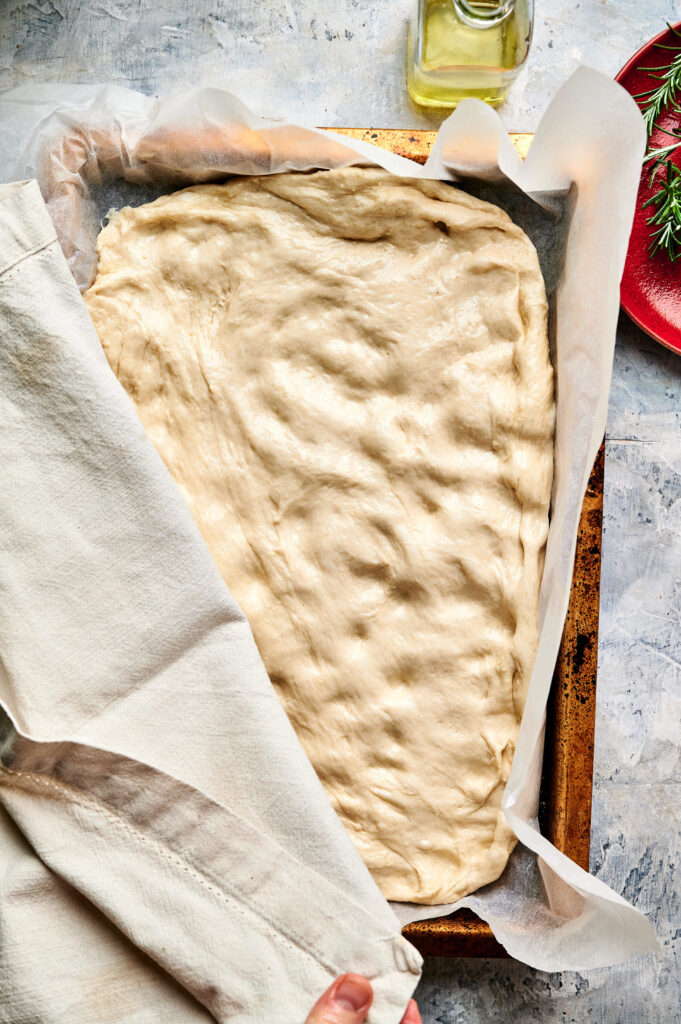 Don’t worry if it doesn’t fully reach the corners, as it will still continue to expand. Cover the pan to let the dough rise again for another 3 to 4 hours, until it looks visibly puffed and airy.