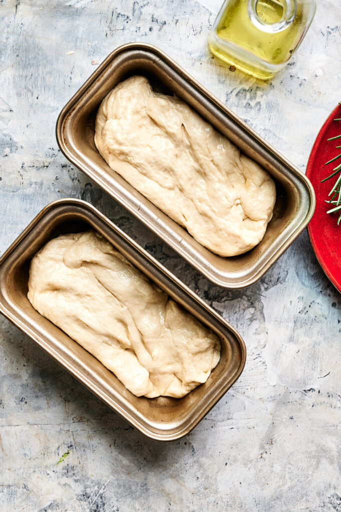 - Generously oil a 9×13-inch baking pan with 1 tablespoon of olive oil. Transfer the dough to the pan and gently stretch it toward the corners. Cover and let it rise for another 3–4 hours, until visibly puffy and airy.