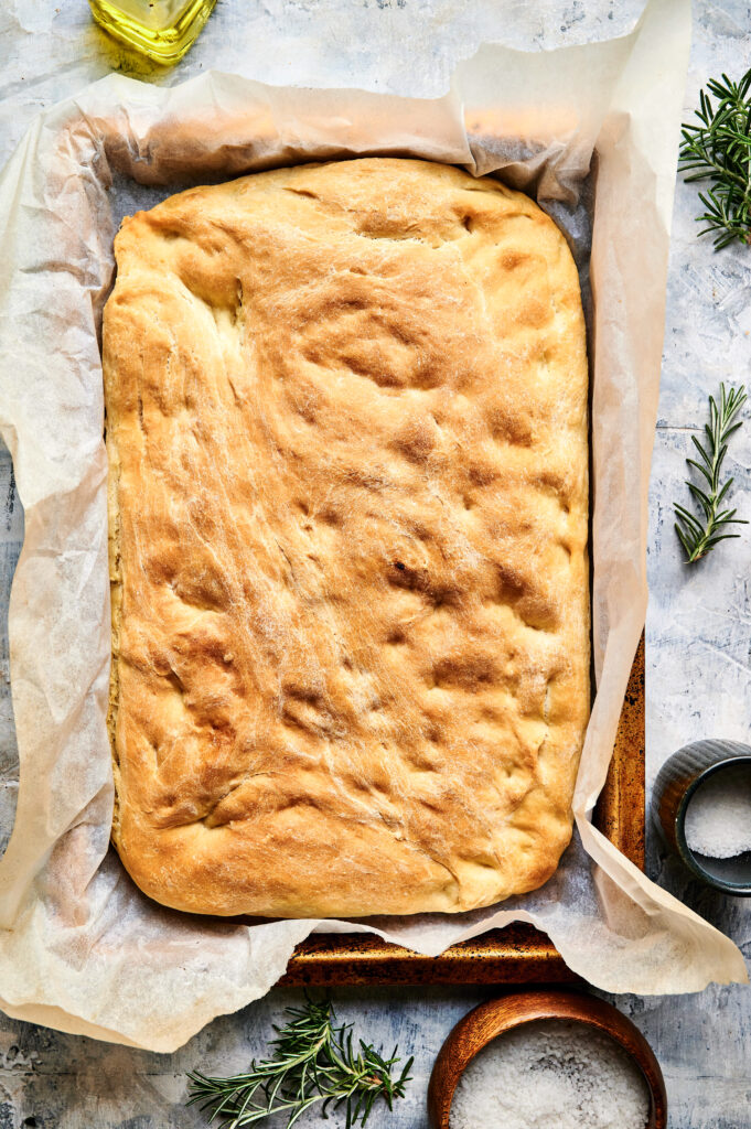 The dough should double in size and develop lots of bubbles—signs that your sourdough starter is doing its job. Otherwise, your starter may not be strong enough yet, and the focaccia might turn out dense.
