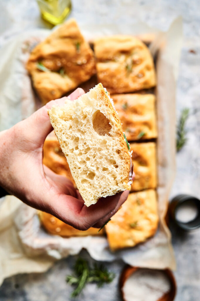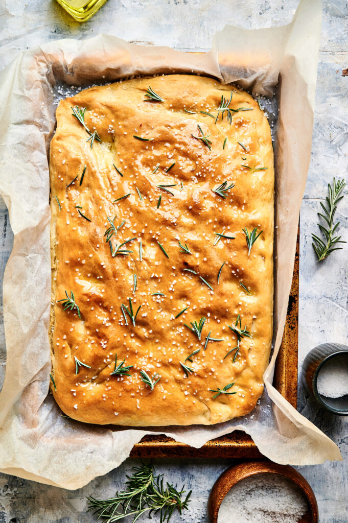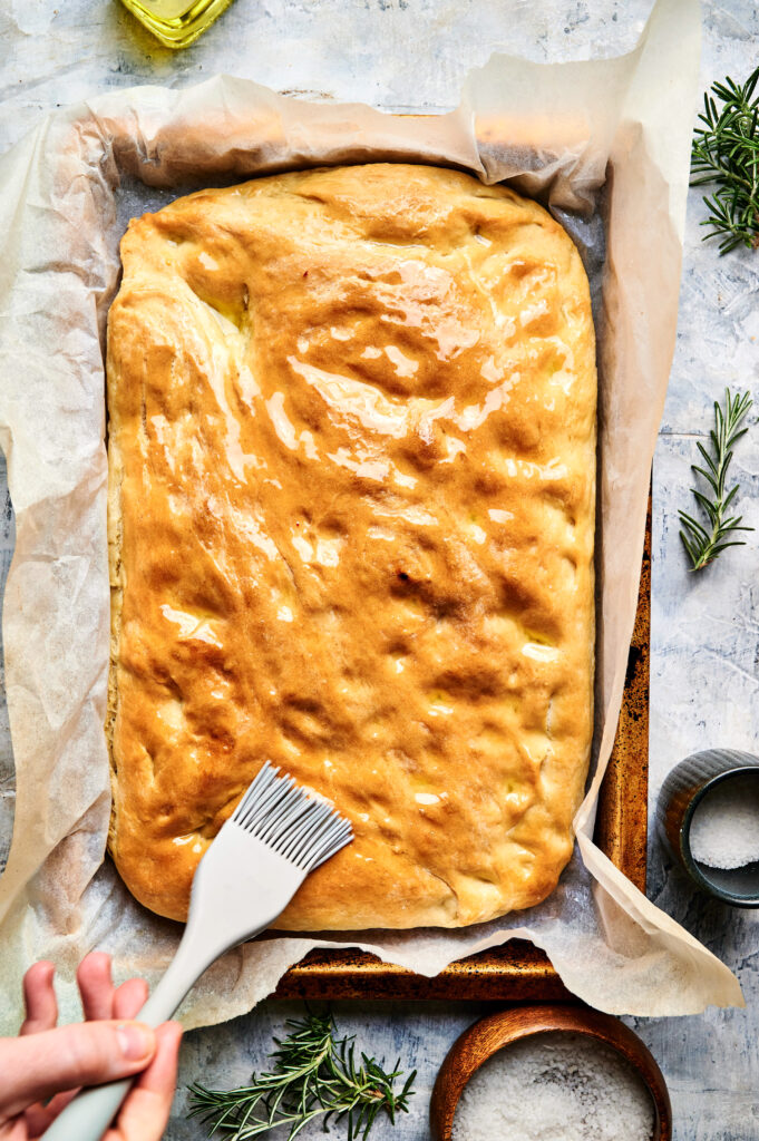 While it’s still warm from the oven, brush it with a bit more olive oil and sprinkle generously with flaky sea salt and freshly chopped rosemary, so the flavors absorb better and you get a boost of aroma.