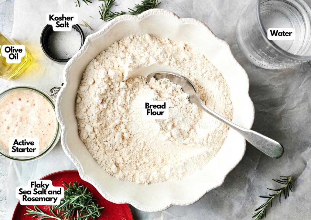 - In a large bowl, combine the flour and salt. Create a well in the center and add the starter and water. Drizzle in 2 tablespoons of olive oil. Mix by hand or with a spoon until a shaggy dough forms.½ cup active starter, 2 teaspoons kosher salt, 1 ¾ cup water, 3 tablespoons extra-virgin olive oil, 4 cups bread flour
