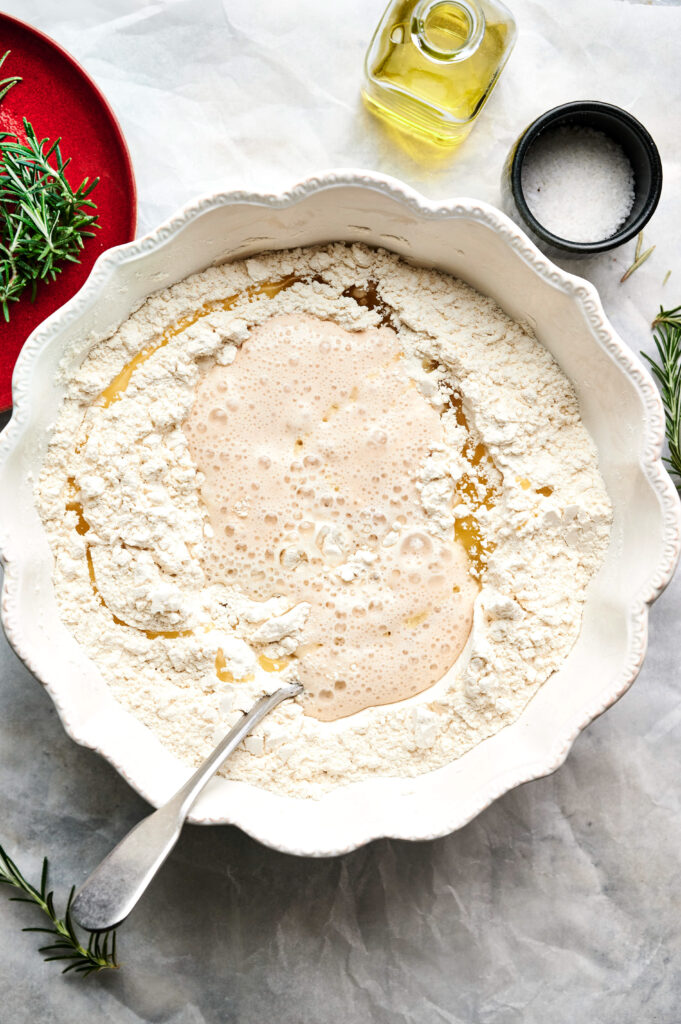 Drizzle in two tablespoons of extra-virgin olive oil. Mix everything together with your hand or a spoon just until it forms a rough, shaggy dough—overmixing can make the dough tighter and harder to stretch later during the folding process.