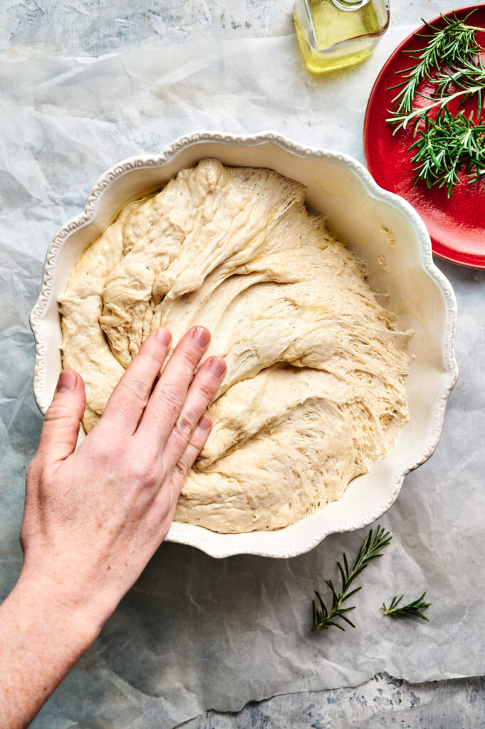 - Grease the pan well: The olive oil not only keeps the dough from sticking but also gives the focaccia a deliciously crispy crust.