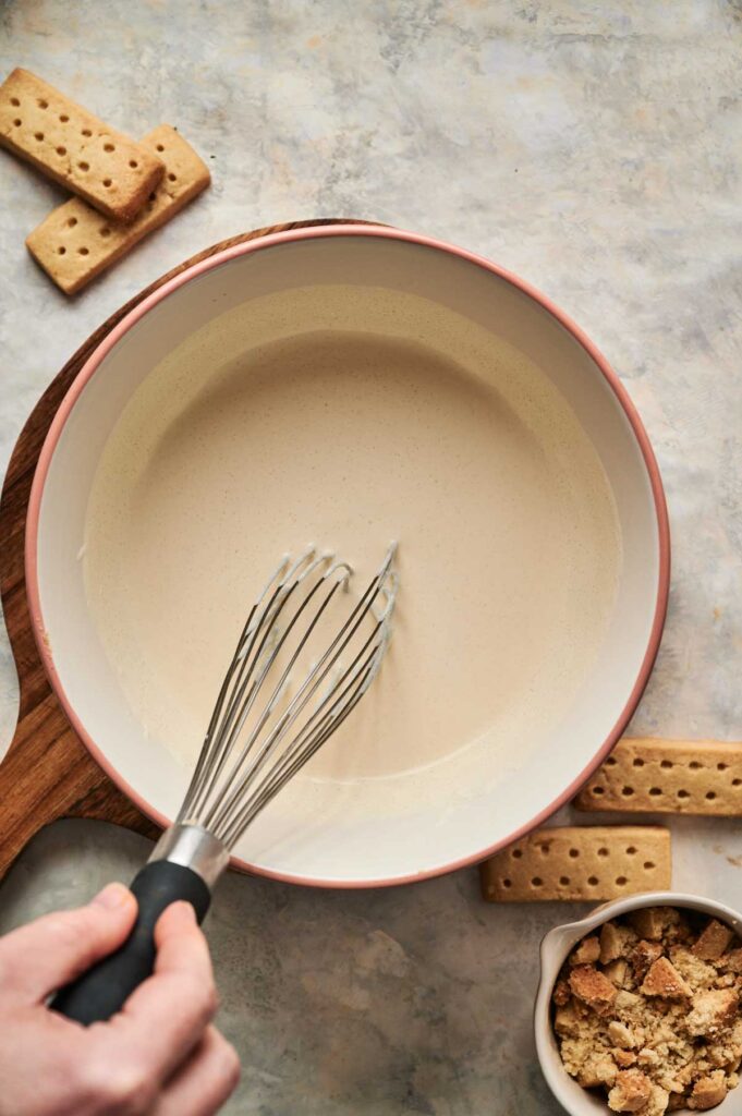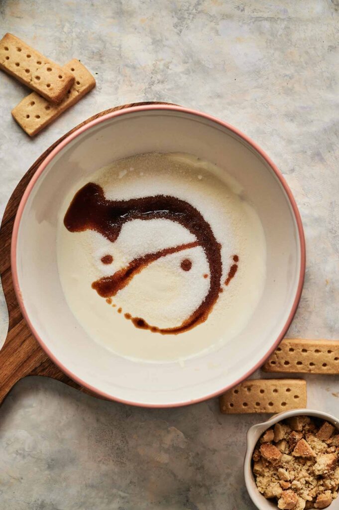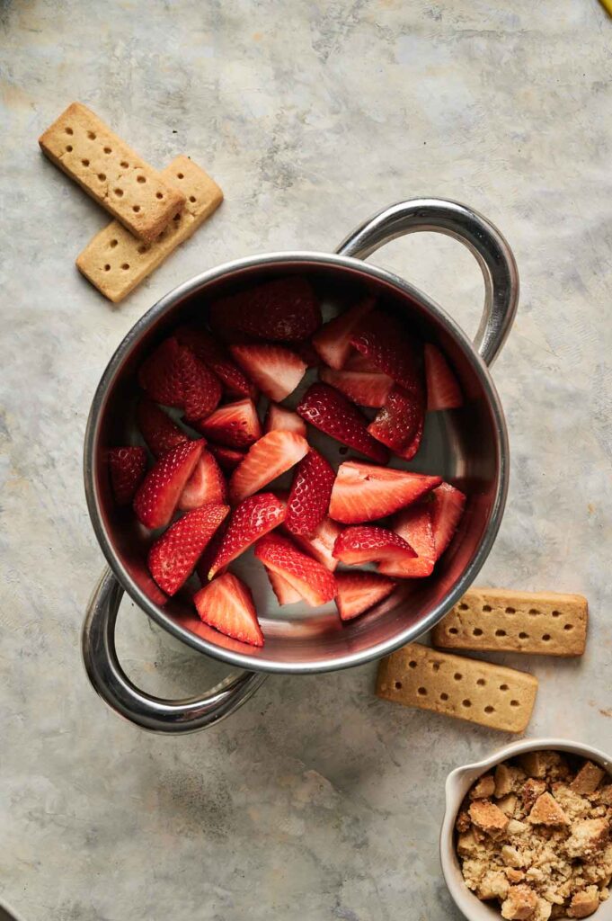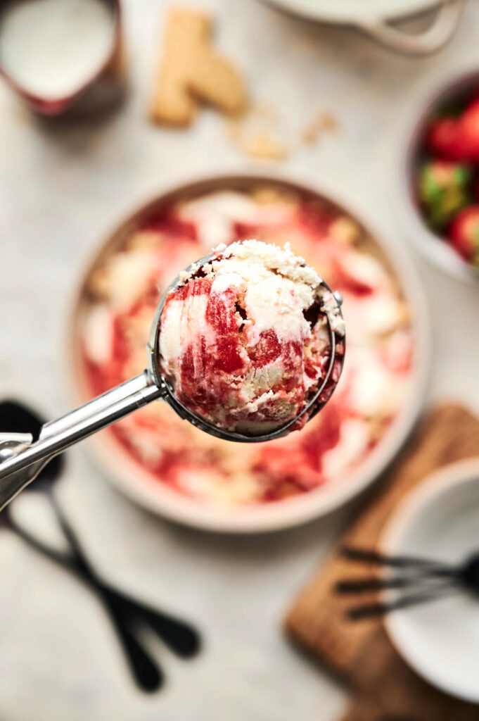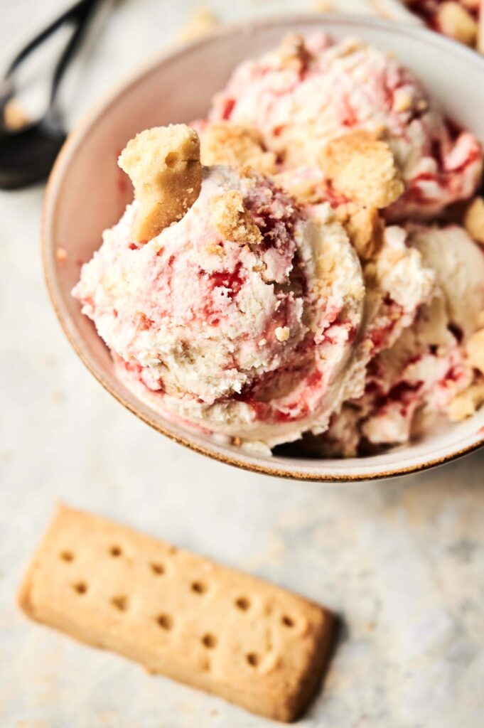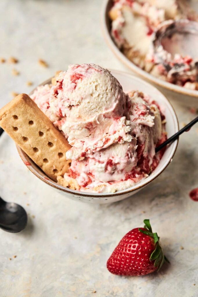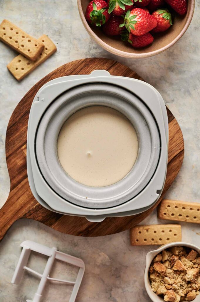 If you don’t have shortcake cookies, you can easily swap in shortbread cookies or vanilla wafers for a similar buttery crunch. Set the crushed pieces aside until you’re ready to layer them into the ice cream.