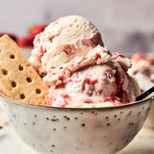 This cold dessert pairs well with other fruity treats like berry pie, lemon bars, or a slice of peach crisp. You can also try making your own strawberry ice cream sandwiches with this recipe using sugar cookies, sandwich cookies, or even a layer of cookie crumbs for texture, or scoop it over warm pound cake, waffles, or serve it as part of a strawberry shortcake ice cream cake.