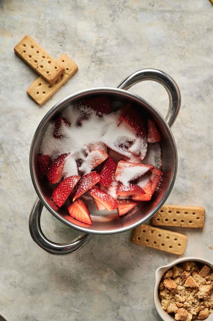 - In a medium saucepan, combine diced strawberries and sugar. Cook over medium heat, stirring occasionally, until the mixture comes to a gentle boil.3 cups diced strawberries, ½ cup granulated sugar