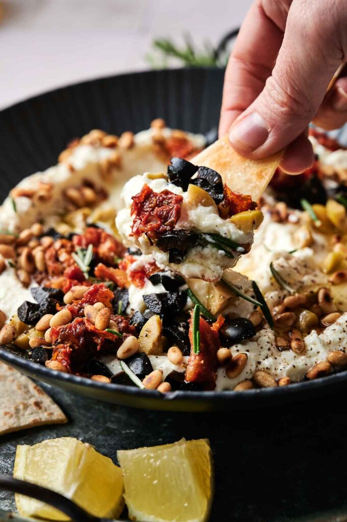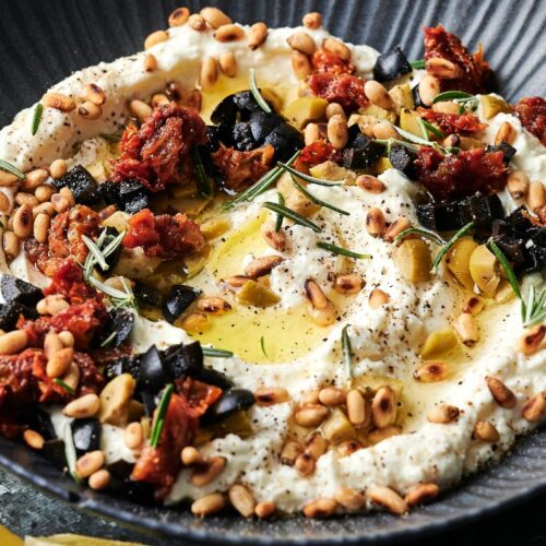 Spoon the whipped feta into a shallow bowl or serving dish, and use the back of a spoon to swirl the top. Drizzle with olive oil, then sprinkle on the chopped black and green olives, sun-dried tomatoes, toasted pine nuts, and a handful of fresh herbs.
