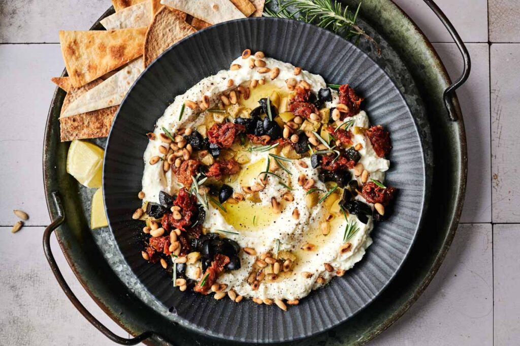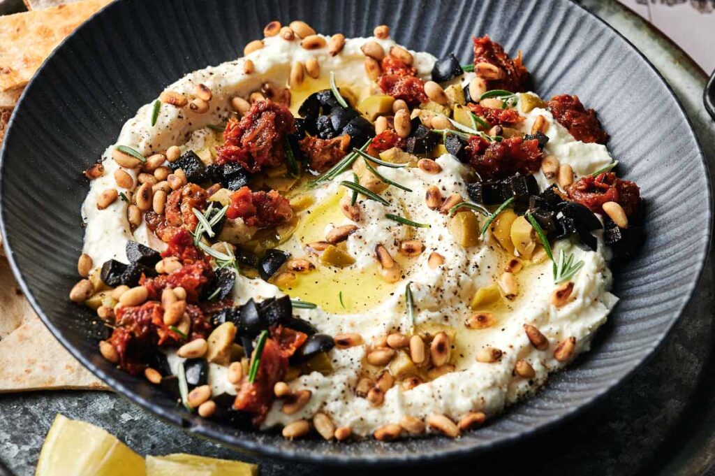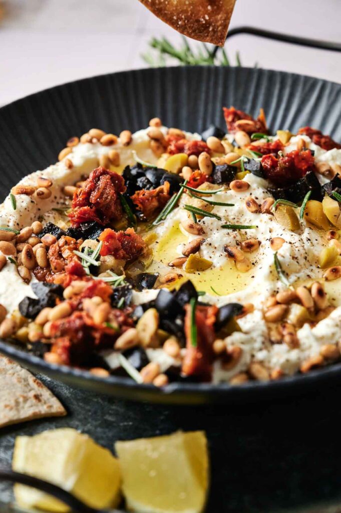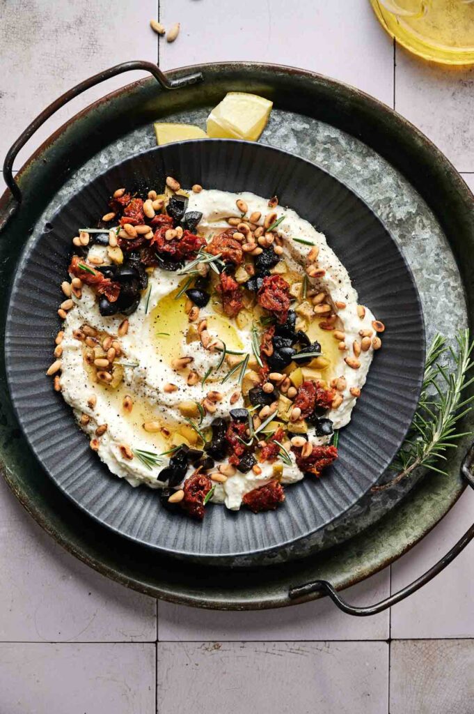 - Transfer the whipped feta to a shallow bowl or serving dish. Use the back of a spoon to create swirls in the surface. Drizzle with olive oil and sprinkle with chopped olives, sun-dried tomatoes, toasted pine nuts, and fresh herbs.Olive oil, Black olives, Sun-dried tomatoes, Fresh herbs, Green olives