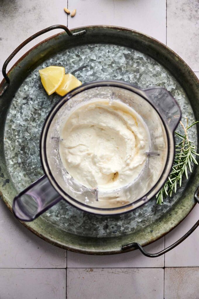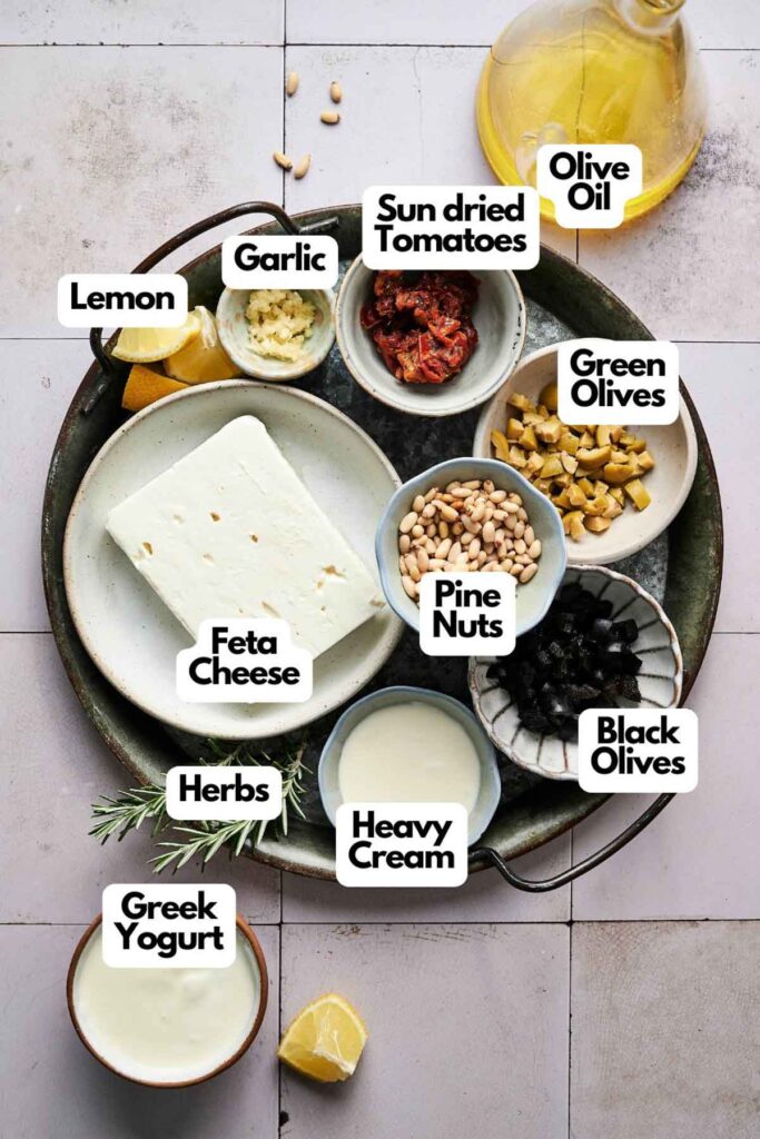 - In a food processor or high-speed blender, combine the feta cheese, Greek yogurt, olive oil, garlic, lemon juice, and heavy cream. Blend until smooth, creamy, and light.1 cup feta cheese, ½ cup Greek yogurt, 3 tablespoons olive oil, 1 clove garlic, 1 tablespoon lemon juice, 2 tablespoons heavy cream