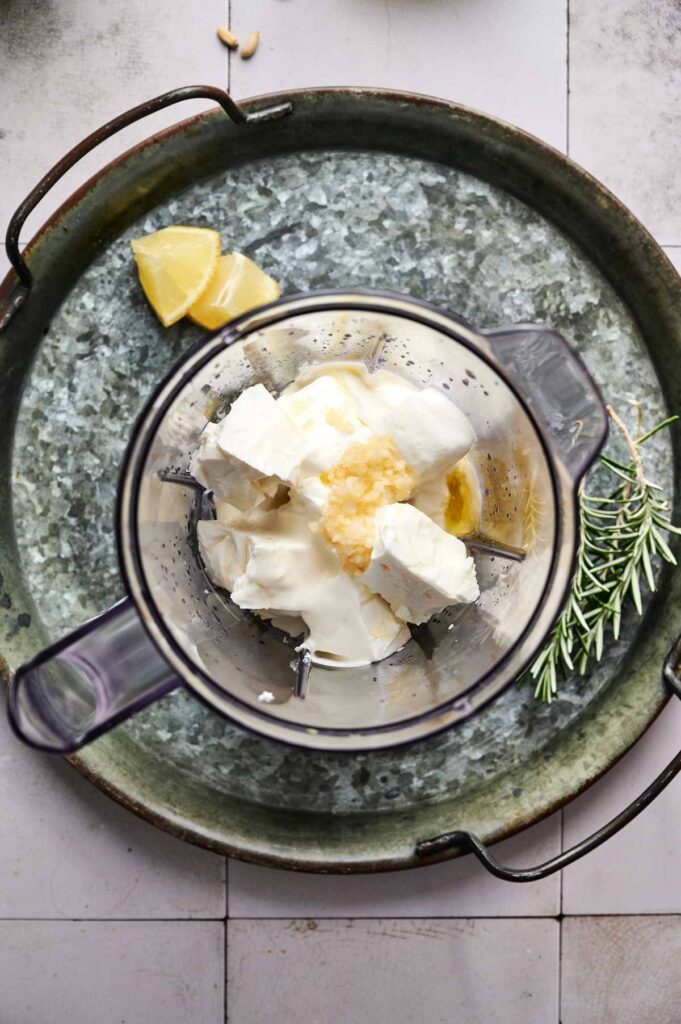 Place the block of feta cheese, Greek yogurt, olive oil, garlic, lemon juice, and heavy cream in a food processor or high-speed blender.