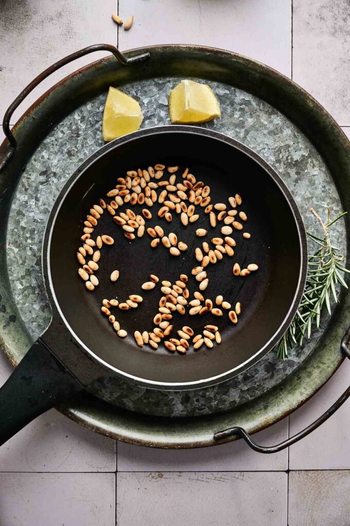 - In a small dry skillet over medium heat, toast the pine nuts for 1–2 minutes, stirring often, until golden and fragrant. Remove from heat and set aside.Pine nuts